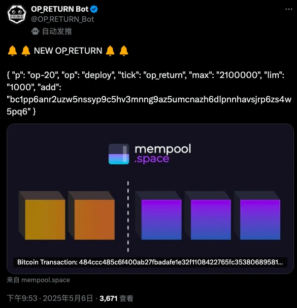 op_return 疑似由地址 bc 1 p...4 w 5 pq 6 于 5 月 6 日 晚间部署 ,总量为 210 万,共 2100 张。如下图 Bot 推送,其代币部署格式与 BRC-20 并无本质区别,只是在 json 文本中多了地址(这可能也是 OP-20 超出 80 字节限制的原因)。