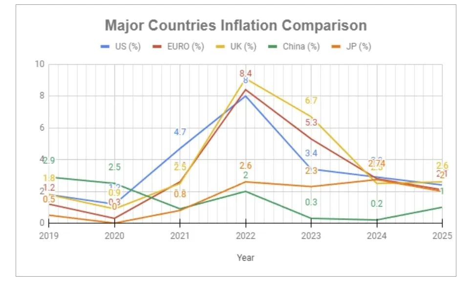 中国在 2019 年通货膨胀率约为 2.9% ,美国的通货膨胀率为 2.3% ,当时因为 2020 年因为新冠疫情补助,我们预测美金大幅度增发补贴估计将会造成 2020 年-2022 年的通货膨胀率大幅提升。而美国的通货膨胀率也确实来到了 8% 的高位,随后由于美联储加息政策逐年下降。2024 年为止下降到了 2.2% 左右,中国的年通货膨胀约为 0.2% ,是主要国家限制通膨率较好的(2019 – 2024 年:数据来自各国官方统计机构。2025 年:数据为国际货币基金组织 IMF 报告与实际更新的预测值。)大多数发达国家数据统计在 2.5% 左右,但实际购物与货币贬值的体验感应该明显大于数据统计。