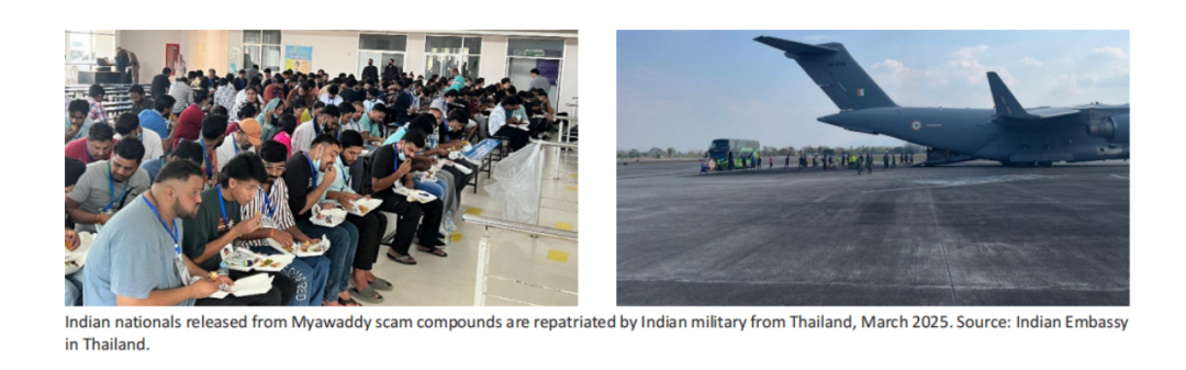诈骗产业的扩张伴随着系统性的人口贩运和强迫劳动。诈骗园区人员来源遍布全球50 多个国家,尤其来自中国、越南、印度、非洲等地的年轻人,常因“高薪客服”或“技术岗位”的虚假招聘被骗入境,护照被扣押、遭受暴力控制甚至多次转卖。2025 年初,仅缅甸克伦邦一次性就遣返逾千名外籍受害者。这一“诈骗经济 + 现代奴役”模式已不再是个别现象,而是贯穿整个产业链的人力支撑方式,带来严重人道危机和外交挑战。