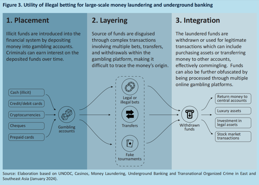 报告指出,随着东南亚合成毒品市场趋于饱和,犯罪集团正在快速转型,以诈骗、洗钱、数据交易、人口贩运为牟利手段,并通过在线博彩、虚拟资产服务商、Telegram 地下市场与加密支付网络构建起跨境、高频、低成本的黑产系统。这一趋势最初在湄公河次区域(缅甸、老挝、柬埔寨)集中爆发,并迅速向南亚、非洲、拉美等监管薄弱地带扩散,形成明显的“灰色出口”。