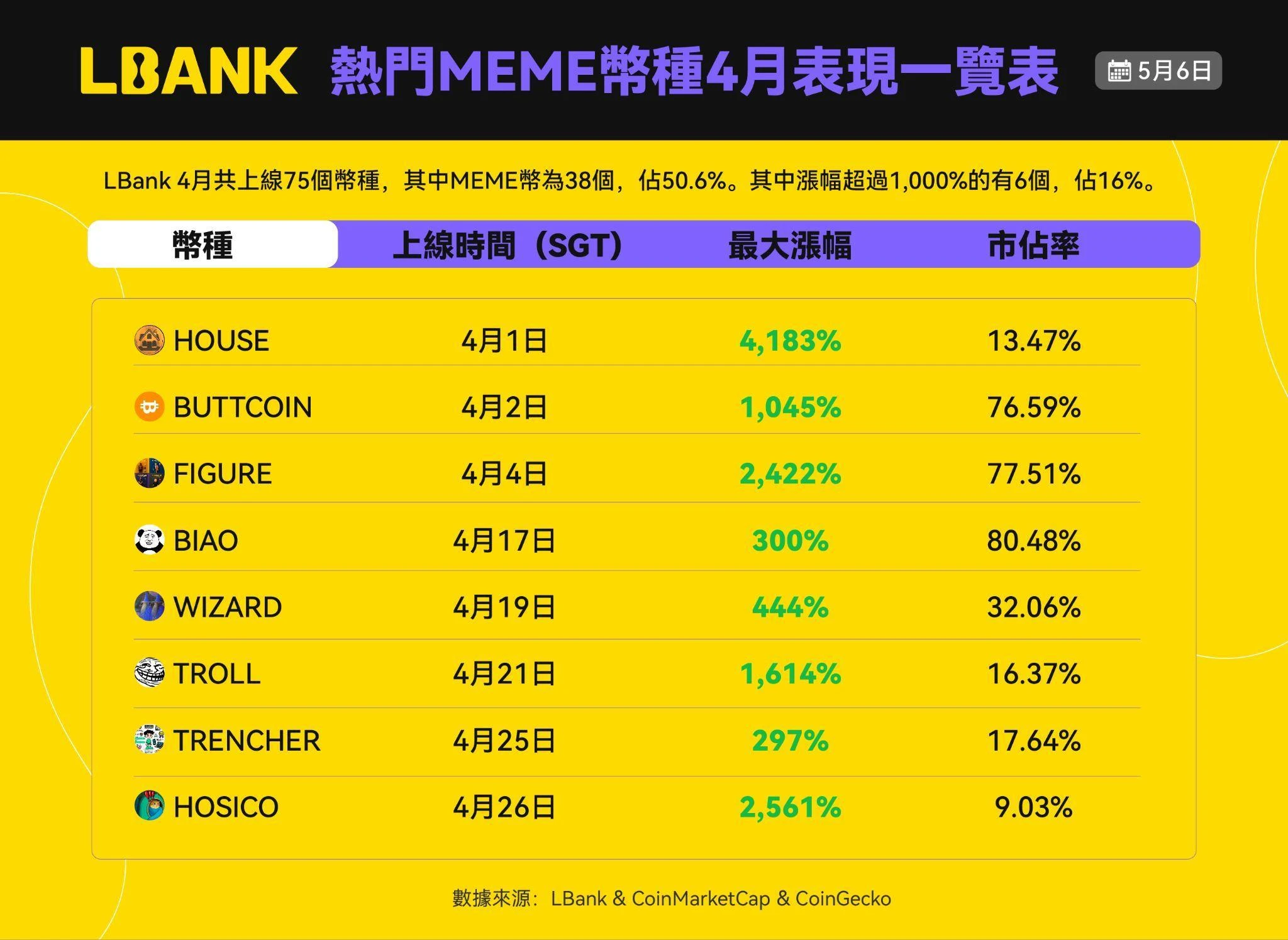 4 月上市的前五大 Meme 币平均涨幅达 3, 166% ,远超其他主流 CEX。