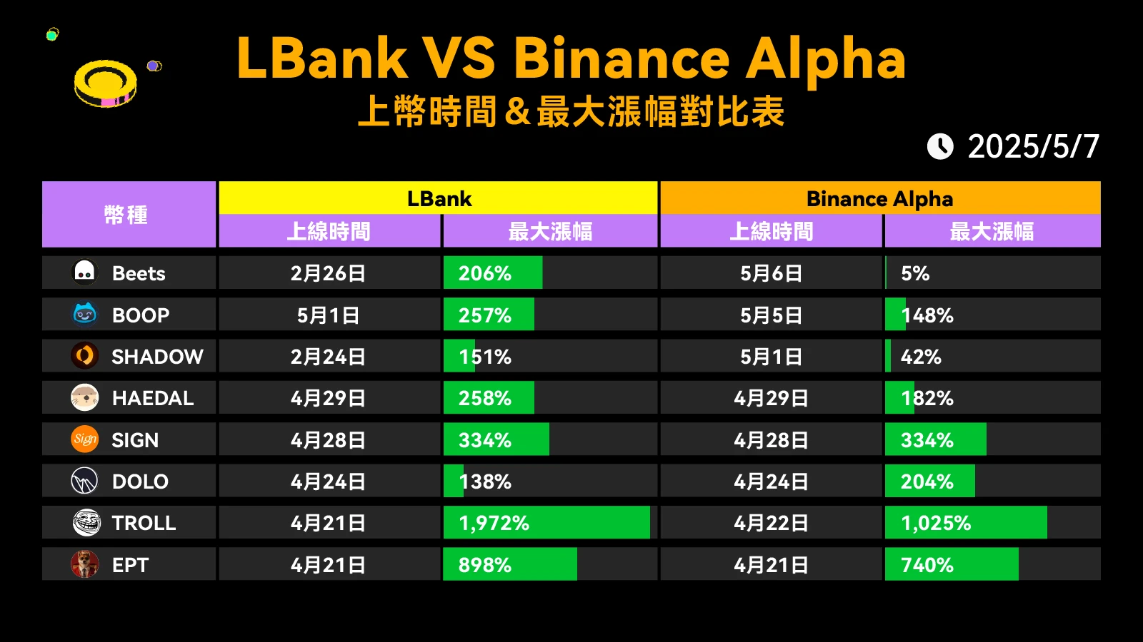 更关键的是社区运营的穿透力。LBank 并不只是个交易平台,它是 Meme 浪潮中的“投机共振器”。依托其社群布局与精准引导,许多原本边缘的亚文化代币被快速放大。例如,LBank 首发的 SYRUP 代币近日上线 Binance Alpha,而这种“首发 LBank,再上 Binance Alpha”的例子不胜枚举,下图是多个币种的信息对比。