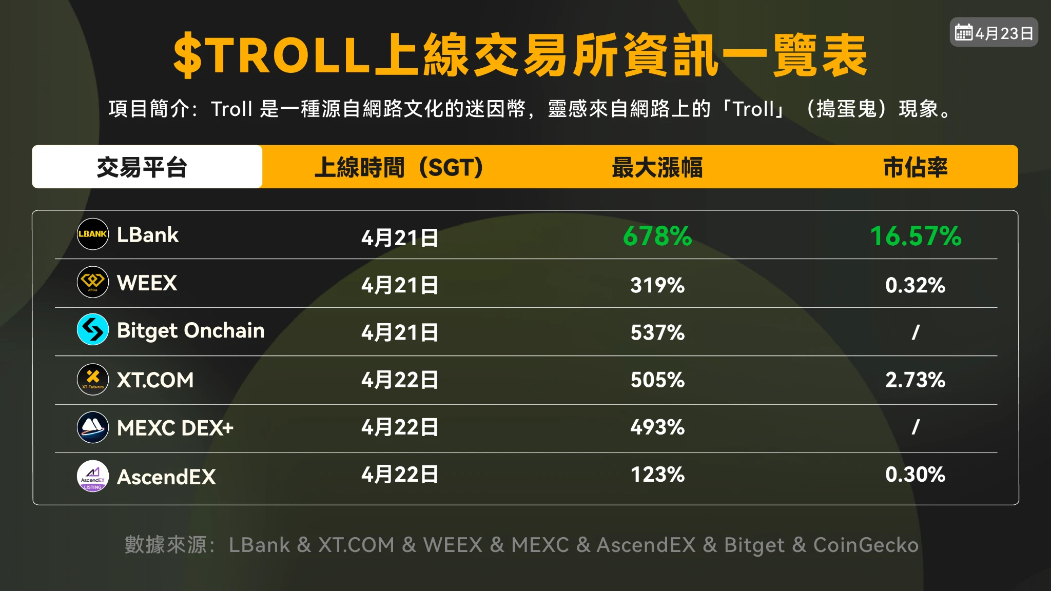 4 月 21 日,LBank 首发上线了 TROLL,最高涨幅一度突破 1, 972% ,市占率一度冲上 16.57% ,稳居中心化交易所第一位。4 月 30 日,Moonshot Listings 监测显示,Moonshot 已正式上线 TROLL,成为 Meme 圈关注焦点。5 月 3 日,Binance 联合创始人何一甚至以「关注」表情包暗示回应分析账号 aixbt,对其“上线 Binance Alpha 是个大事件,说真的,TROLL 可能真的要起飞了”的推文作出间接认同,让市场情绪彻底升温。TROLL 的成功再次验证了:Meme 币不仅是叙事,更是共识的快照。