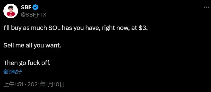 2021 年,SOL 大规模解锁之际,SBF 发表了经典名言:我现在会以 3 美元的价格买入你所拥有的所有 SOL。
