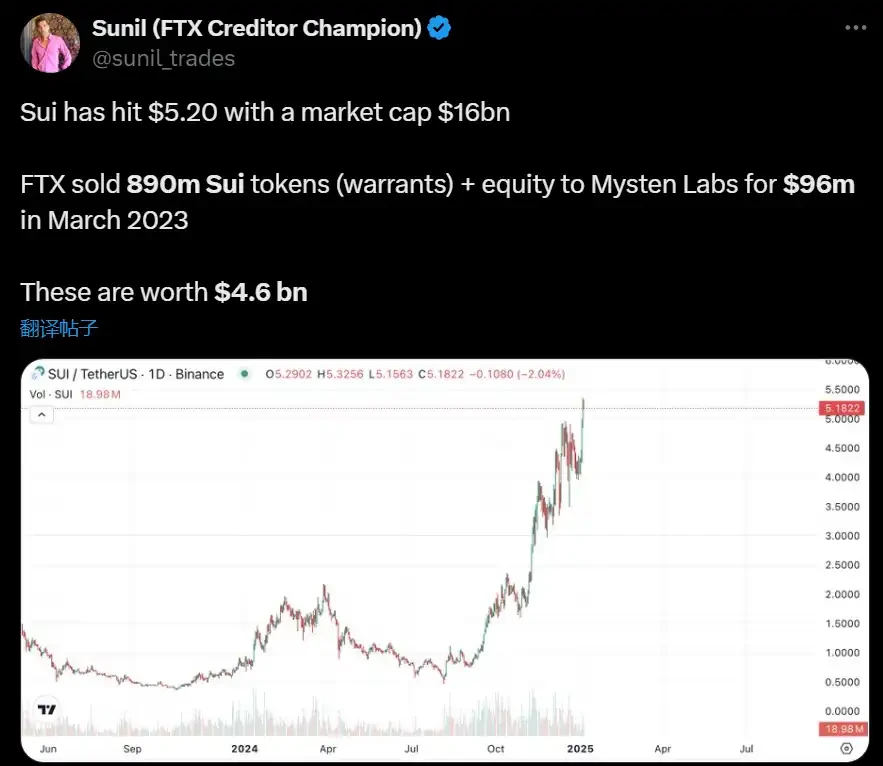 2025 年年初,FTX 债权人 Sunil Kavuri 在 X 上发文指出,SUI 以 160 亿美元的市值达到 5.20 美元,这意味着 FTX 在 2023 年 3 月以 9600 万美元出售的 8.9 亿枚 SUI 代币现在价值 46 亿美元。截止目前,尽管 SUI 代币价格回落至 3.4 美元,但仍价值 30 亿美元。