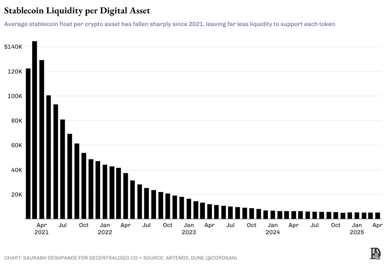 让我来解释一下原因。简而言之,风险投资的回报下降了,而资本成本上升了。因此,由于机会成本较高,追逐交易的风险投资资金减少了。但从加密货币领域特有的原因来看,市场结构受到了资产数量大幅增长的影响。我一直关注这张图表,大多数代币业务都应该意识到这一点。仅仅因为创建新代币容易就去发行,这可能不是一个明智之举。互联网上的资本是有限的。随着每一个新资产的发行,追逐它的流动性就会减少,如下图所示。