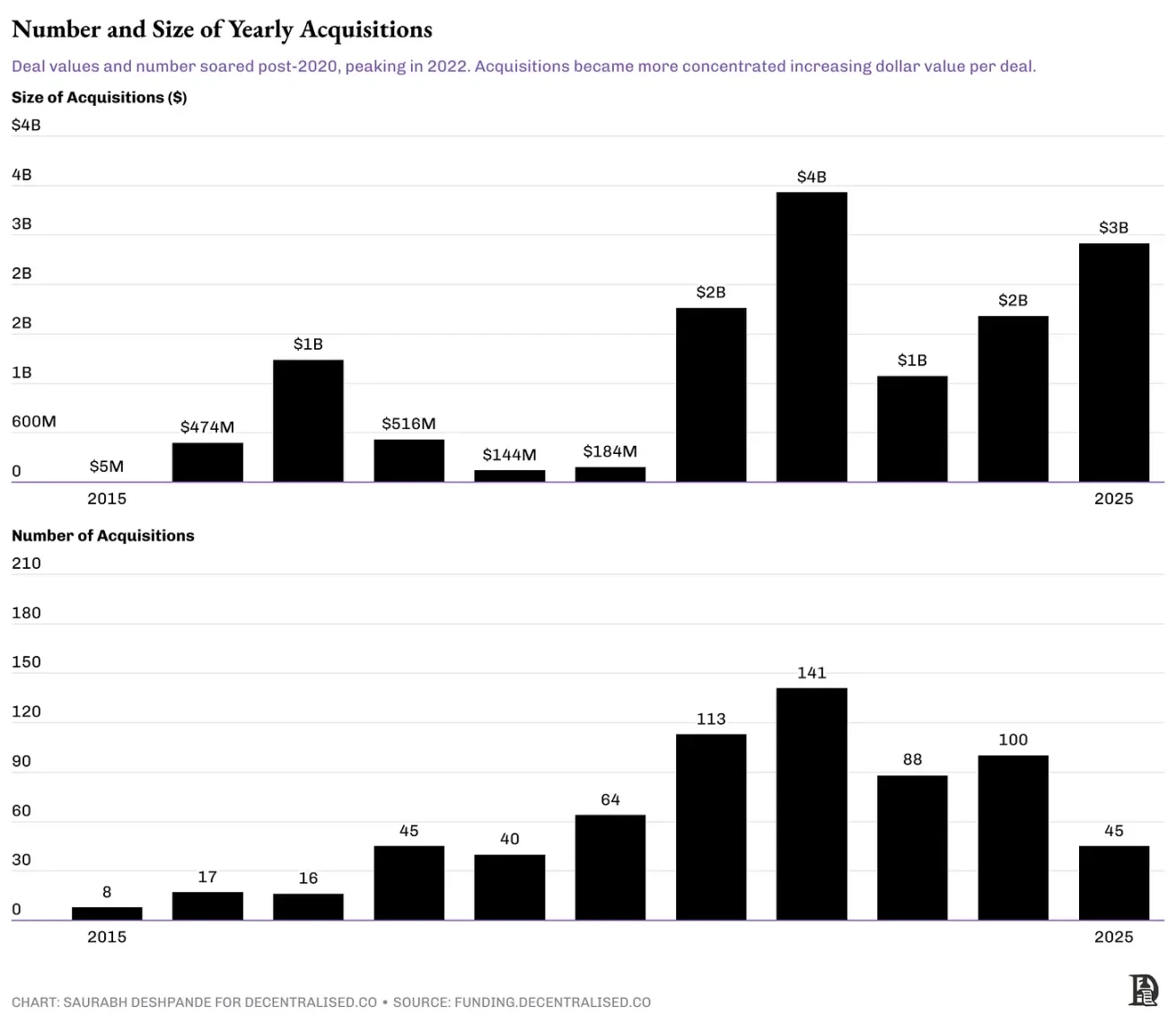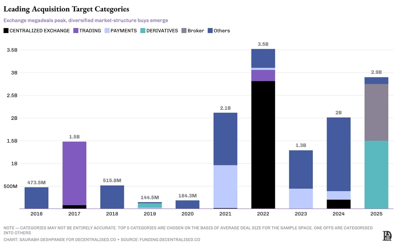 收购方也在不断演变。在 2021-2022 年,交易所通过收购基础设施、钱包和流动性层来捍卫市场份额,引领了并购潮流。到 2023-2024 年,接力棒传递到了支付公司和金融工具平台手中,它们瞄准的是 NFT 渠道、经纪商和结构化产品基础设施等下游产品。但随着监管的变化和衍生品市场的服务不足,像 Coinbase 和 Robinhood 这样的交易所又重新成为收购方,收购衍生品和经纪基础设施。