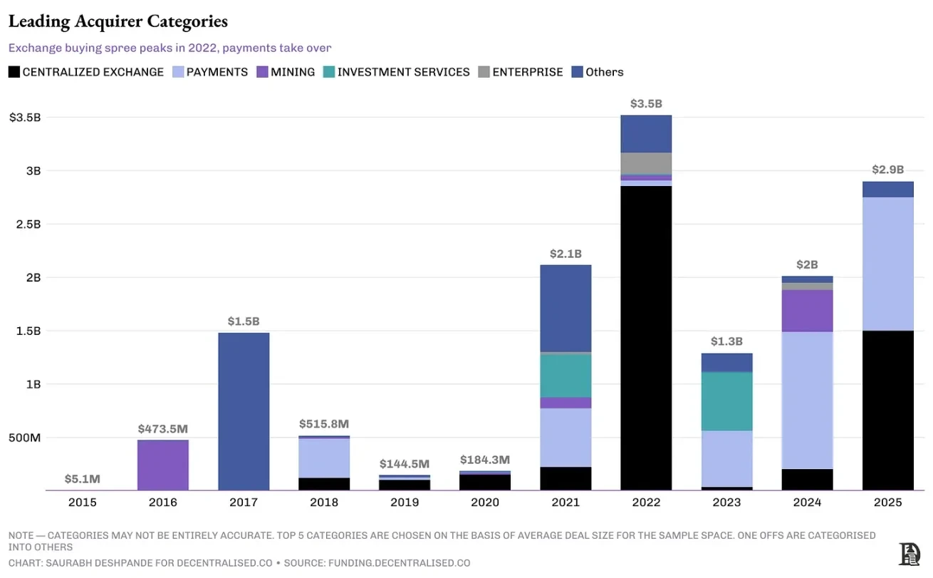 以下是过去十年加密货币收购演变的宏观视角 —— 按交易量、收购方和目标类别划分。