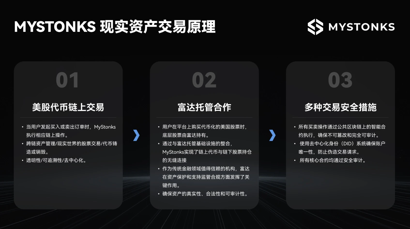 MyStonks.org 相关负责人介绍,当用户在平台上购买美股代币时,其对应的股票由富达进行 托管,从而确保资产的真实性、合规性和可审计性。通过与富达托管基础设施的整合, MyStonks 实现了链上代币与链下股票资产的无缝连接。作为传统金融领域的可信机构,富达 在保障资产安全和合规方面扮演着关键角色,是 MyStonks 实现代币化股票交易的重要合作 伙伴。