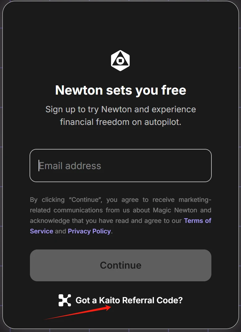登录 Newton.xyz ,输入邮箱登录。 特别提示一下,登录页面有一个输入邀请码的选项。如果你属于 Kaito 前 20, 000 名活跃用户(发言超过 4 次),可前往 Kaito 奖励中心领取专属推荐码,享受额外福利。