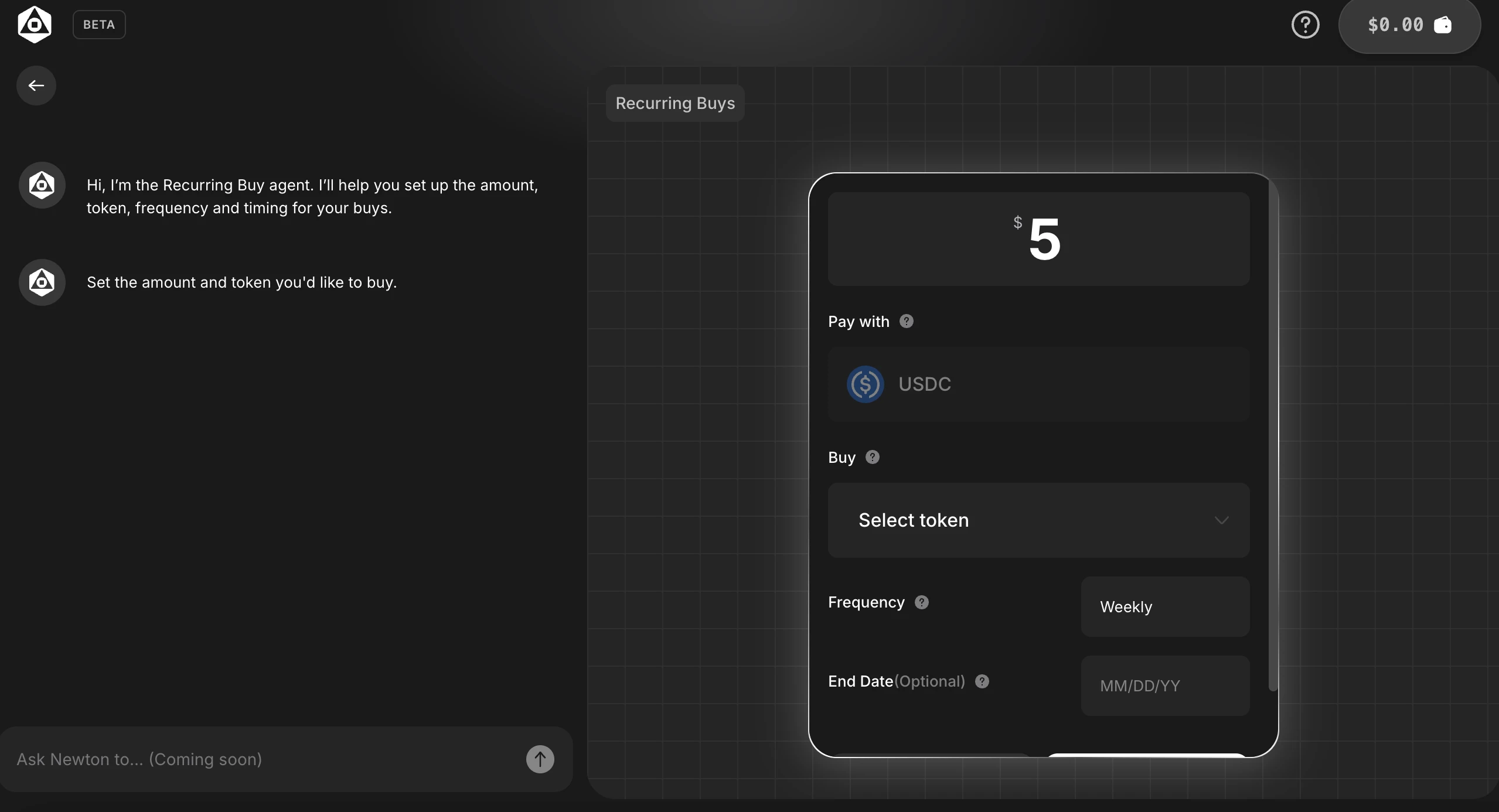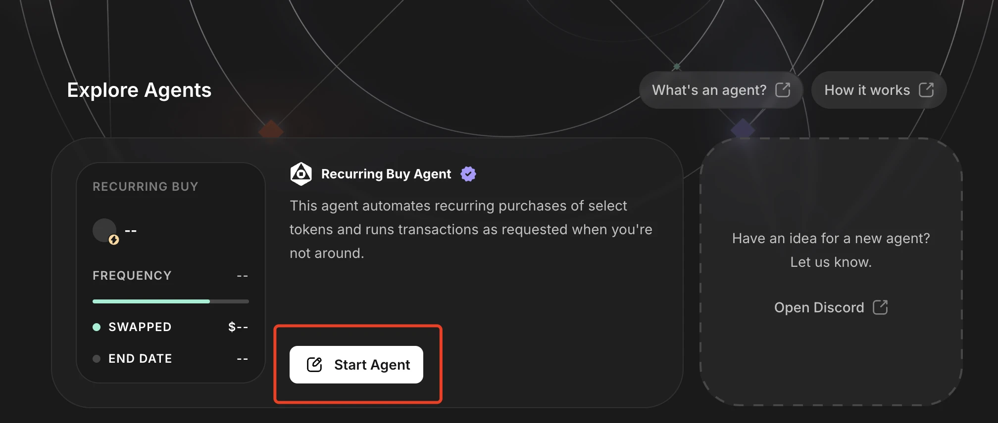 点击“Start Agent”,就可以设置一个自动化代理。然后设置购买币种、购买频率和截至时间或是直到资金用完。这部分任务完成可直接获得 500 积分。