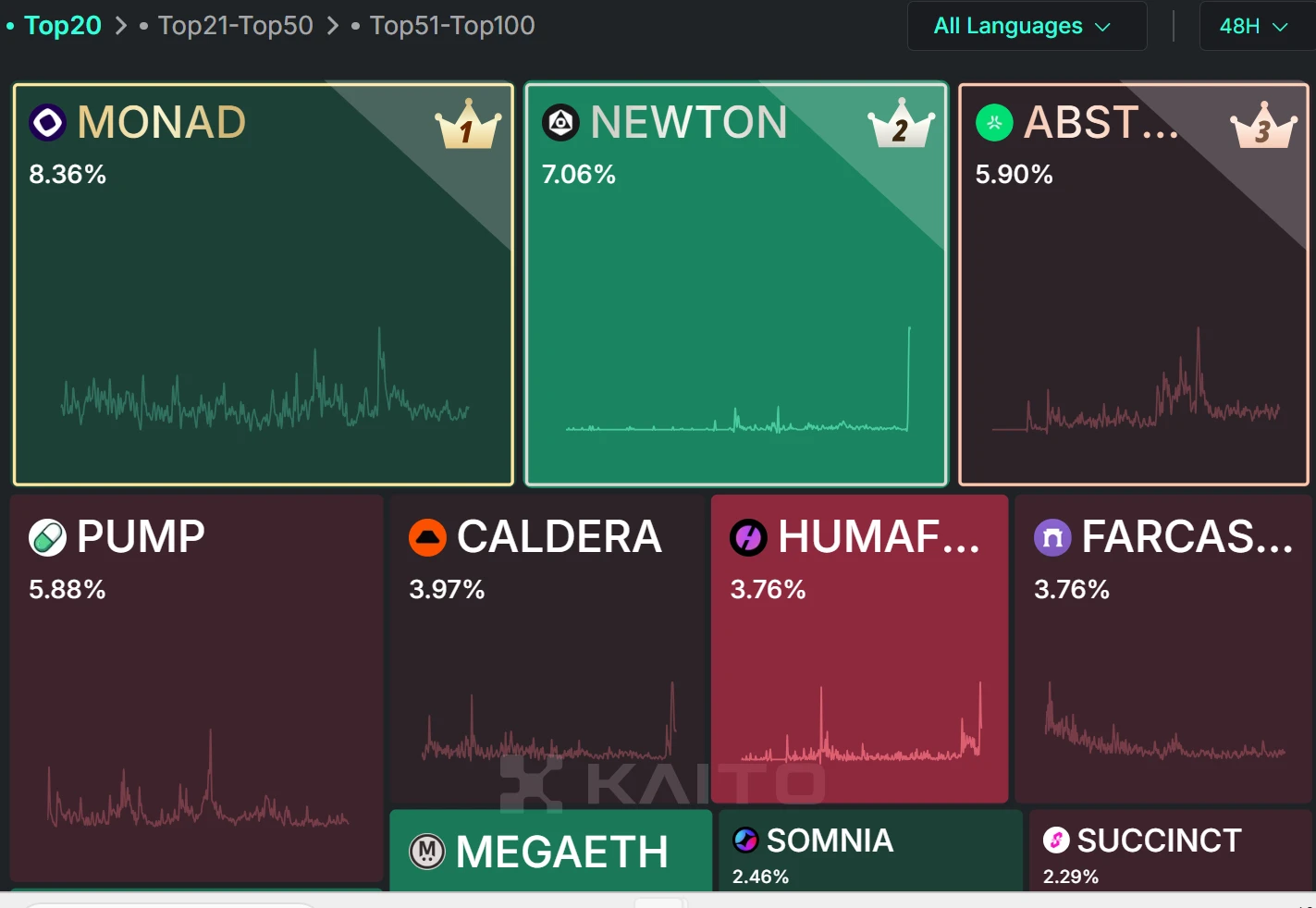 Newton 将 0.75% 的代币总供应分配给 Kaito 社区 Yappers 的举动,吸引了大量用户参与。 目前,Newton 在 Kaito 48 小时热度榜已经攀升至第二位。 通过在 Kaito 社区积极互动、发布优质话题,是能 以极高的性价比获得 Newton 代币空投的途径。