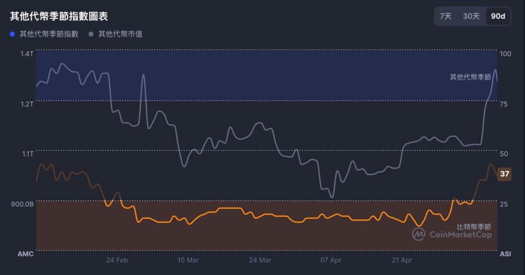 同时间,CMC 统计的 山寨季指数 近日已触底回升站上 40,创下近 90 天内高点。引发山寨季(Altcoin Season)是否将来临的热议。