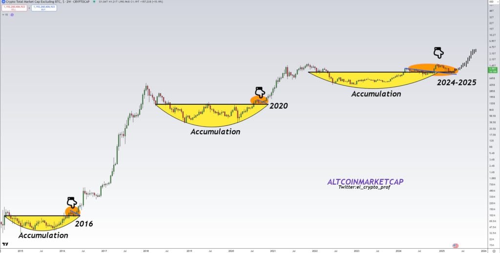 技术交易员 Moustache 也指出,山寨币经历重複积累后常现爆发性增长,认为当前市场结构与 2016、2020 年相似,宣称「 2025 年山寨币季节已正式𫔭始 」。
