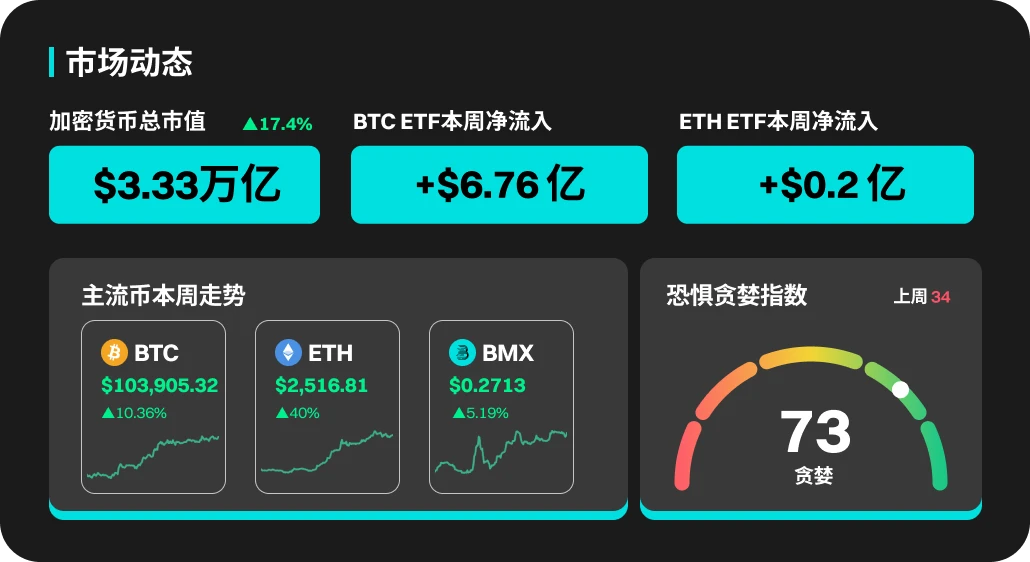 上周 BTC ETF 净流入 9.2 亿美元,实现连续三周净流入,前两周资金流入分别为 30.3 亿美元和 18.1 亿美元,连续的资金流入表明后市乐观。过去一周 BTC 最高触及 105, 000 美元,BTC 有望在 5 月份创下历史新高。过去一周市场贪婪恐慌指数持续攀升,市场情绪进入贪婪阶段。