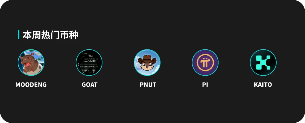 热门币种方面,MOODENG, GOAT, PNUT, PI 和 KAITO 都有着不俗的表现。MOODENG 本周价格上涨 566.53% ,最高价格 0.2889 USDT,目前市值 2.6 亿美金。GOAT 价格上涨 212.9% , 最高价格为 0.2503 USDT,PNUT 价格上涨 167.6% 。