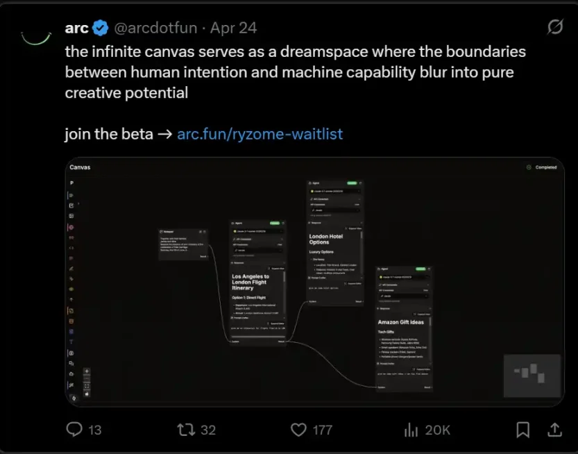 此外,他们还将推出一个「Ryzome Canvas」的无代码 / 节点式 Agent 构建工具,用户可以接入通用的 MCP 服务端资源,以及 Arc 合作伙伴提供的服务与用例,自定义创建代理工作流(类似 Rayon Labs 的 Squad 工具)。