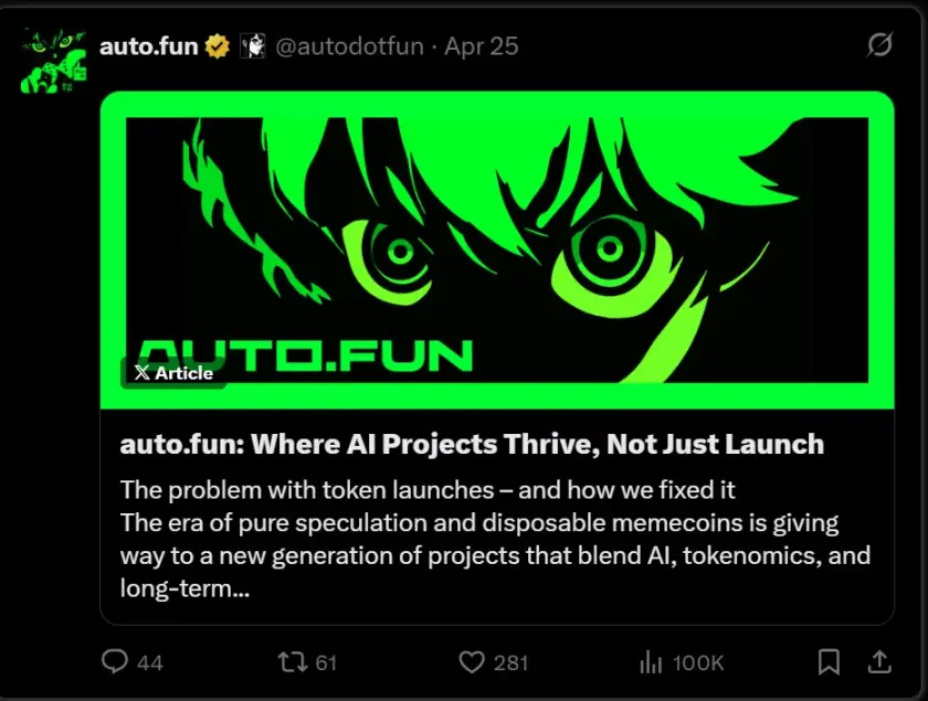 但到目前为止,autodotfun 尚未在同类发射平台中展现出明显差异,也还没有出现真正有趣或独特的项目上线,这让人有些失望。