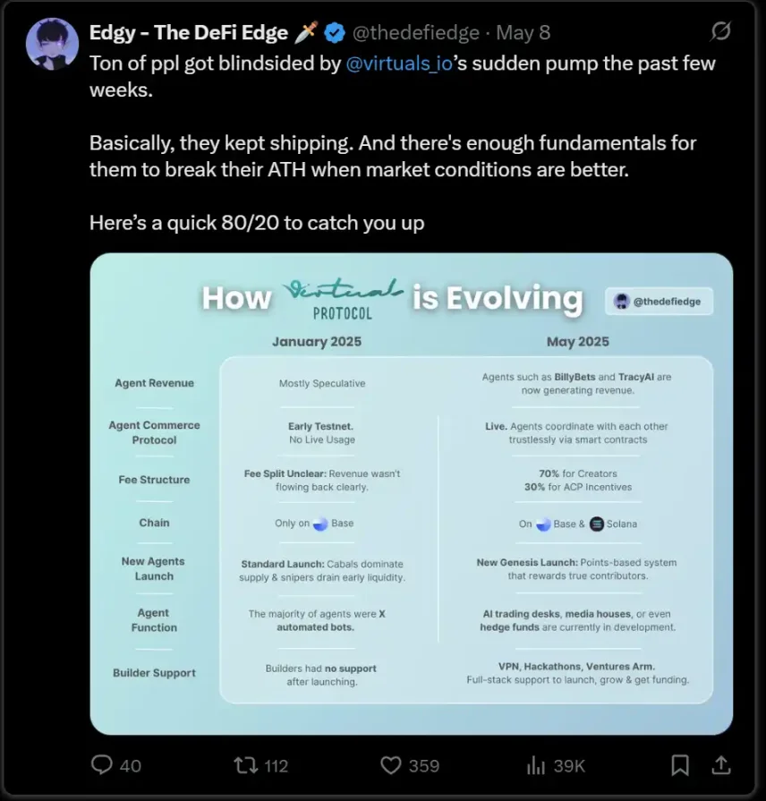 Virtuals 是这方面最强的选手,公开开发、快速修复问题、积极听取社区反馈,还定期推出新功能或叙事,维持用户的持续兴趣,同时也在构建他们的 ACP。此外,他们经常有 Genesis Launch 供新用户参与。