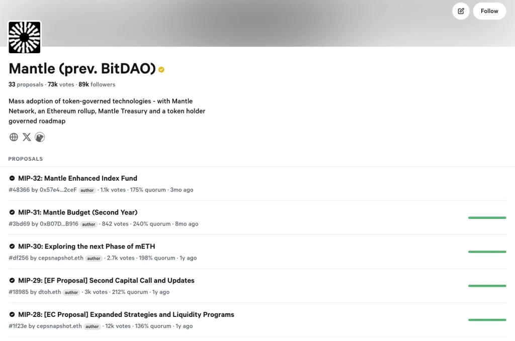 2. 治理代币:MNT 持有者可通过 Mantle DAO(基于 Snapshot 的链下投票)对协议升级、金库支出等提案进行表决, 1 代币等同 1 票。
