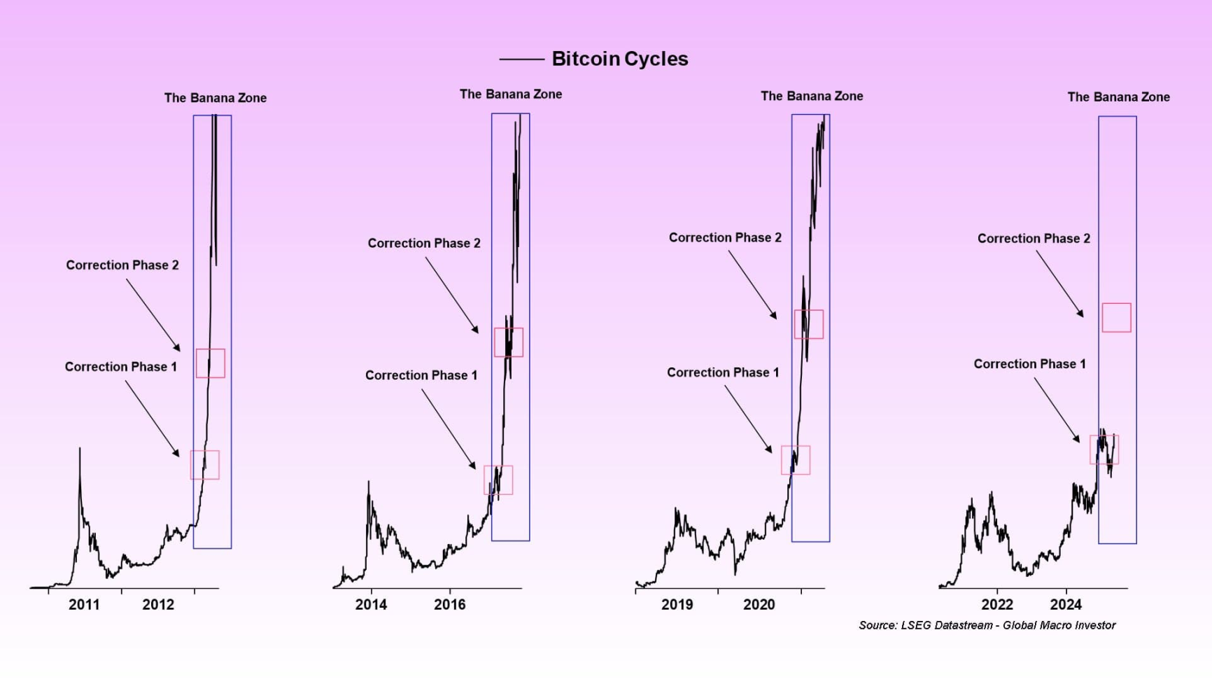 9、全球 M2 与资产关系: 当全球 M2 创新高时,资产价格理应同步上涨。以比特币为例,其价格走势通常呈现突破、回踩,然后在「香蕉区」加速上涨的特征。对比 2017 年周期,比特币当年涨幅达 23 倍,当前市场虽有所不同,但预计仍有可观涨幅。目前市场处于「香蕉区」第一部分突破后的修正阶段,即将进入第二部分,通常这一阶段将迎来山寨币行情。