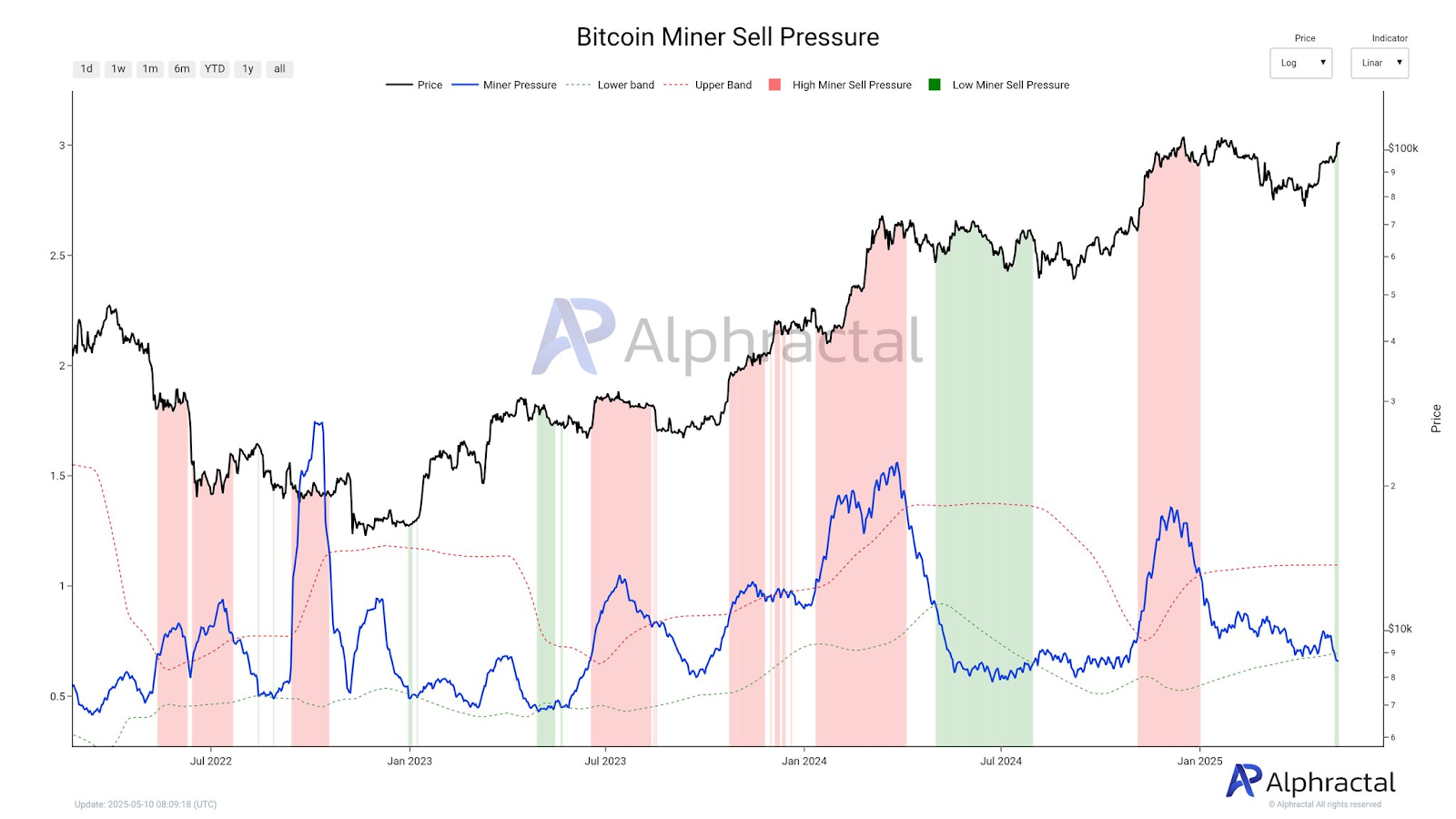 Alphractal的矿工卖压指标显示,当前市场结构与2024年初的“恐慌性抛售”截然不同: