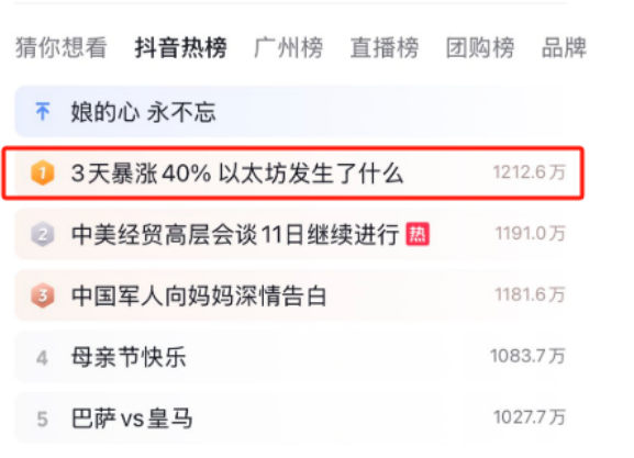 但就在这几天,以太坊口碑迎来了大反转。5月8日,比特币重回10万,ETH来到1900美元,当时市场还未引起重视,但随后以太坊势如破竹,单日创下超过20%的涨幅,3日更是大涨43%,价格回到了2500美元上方,涨幅不仅超过了BTC,还超过了巨大多数的山寨币,再度展现出领涨之姿。这一涨幅让市场炸开了锅,甚至登上了国内社交媒体的热搜,在抖音上,有超过1200万人浏览过词条“3天暴涨40%以太坊发生了什么”,究竟发生了什么?