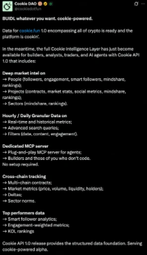Cookie.fun 是一个专注于Web3生态中 AIAgent 的平台,旨在为用户提供一个全面的 AI Agent 指数和分析工具。该平台通过展示 AI Agent 的心智影响力、智能跟随能力、用户互动和链上数据等指标,帮助用户了解和评估不同 AI Agent 的表现。4 月 24 日 Cookie.API 1.0 更新推出了专属 MCP 服务器,该服务器包含即插即用的智能体专用 MCP 服务器、专为开发者和非技术人员设计、无需任何配置。