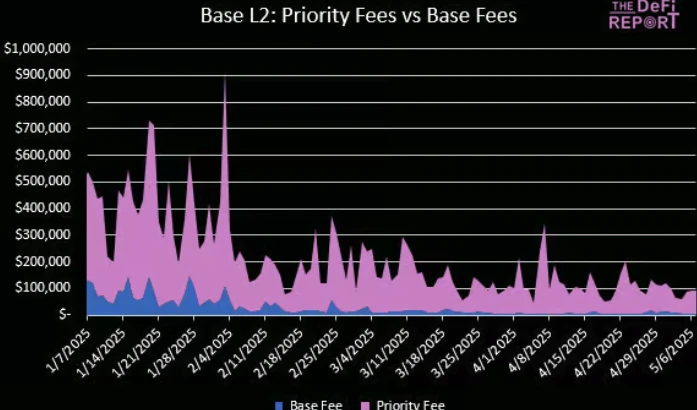 我们认为 MEV 将已优先手续费的形式转移到 L2。下图显示,Base 85% 的手续费来自优先手续费。