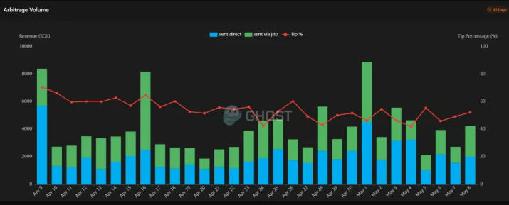 目前,Solana 上大约 50% 的套利 MEV 都是通过 Jito 进行的(该价值通过小费路由器与质押者共享):