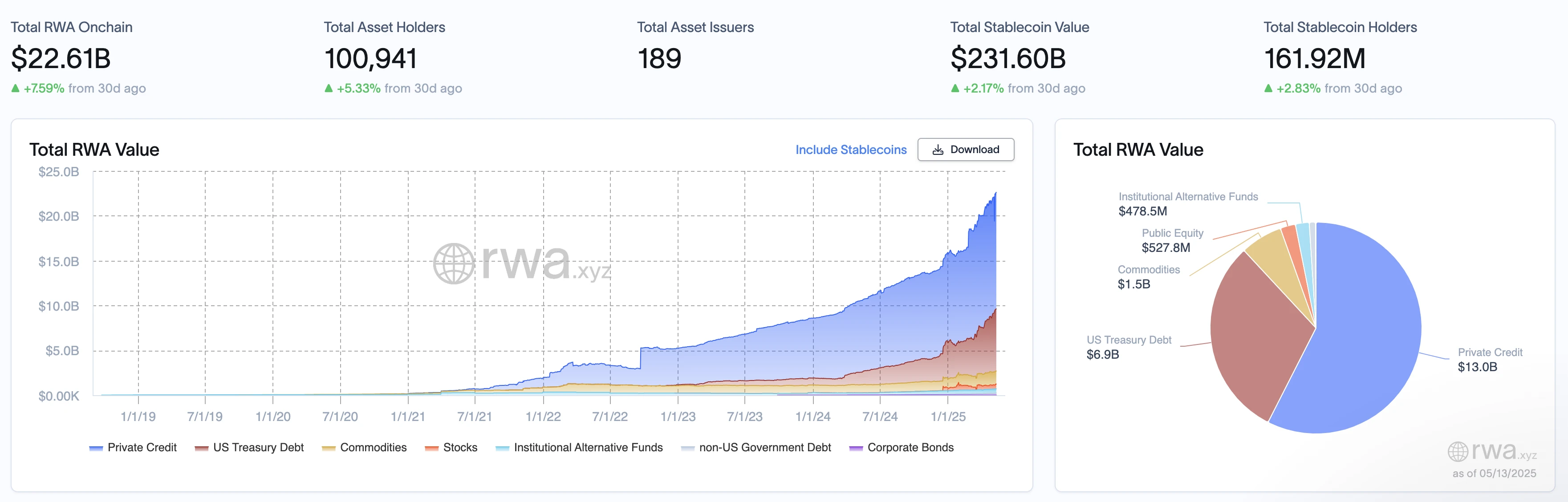 根据 RWA.xyz 数据,截至 2025 年 5 月 13 日,RWA 链上总价值达到 223.8 亿美元,较 30 天前增长 7.59% 。链上资产持有者总数为 100, 941 人,较 30 天前增加 5.33 % ,资产发行数量为 189 个。稳定币总价值为 2316 亿美元,较 30 天前增长 2.17% ,而稳定币持有者数量为 1.6192 亿人,较 30 天前上升 2.83% 。