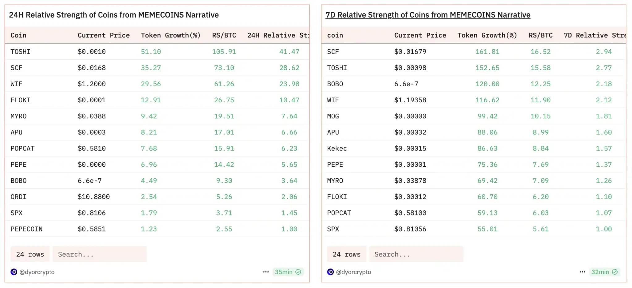 按照 ARKHAM 的 TREEMAP 数据显示,最近一周表现最好前 15 个代币中有一半都是 Solana 的老 Memecoin,其中当属 MoonDeng 与 PNUT 概念最火,知名 KOL 川沐对他购买这两个代币的逻辑是「他们很像早期的 pepe 和 shib」,而无论如何这两个同时期的概念币都在这个周期中表现出色。