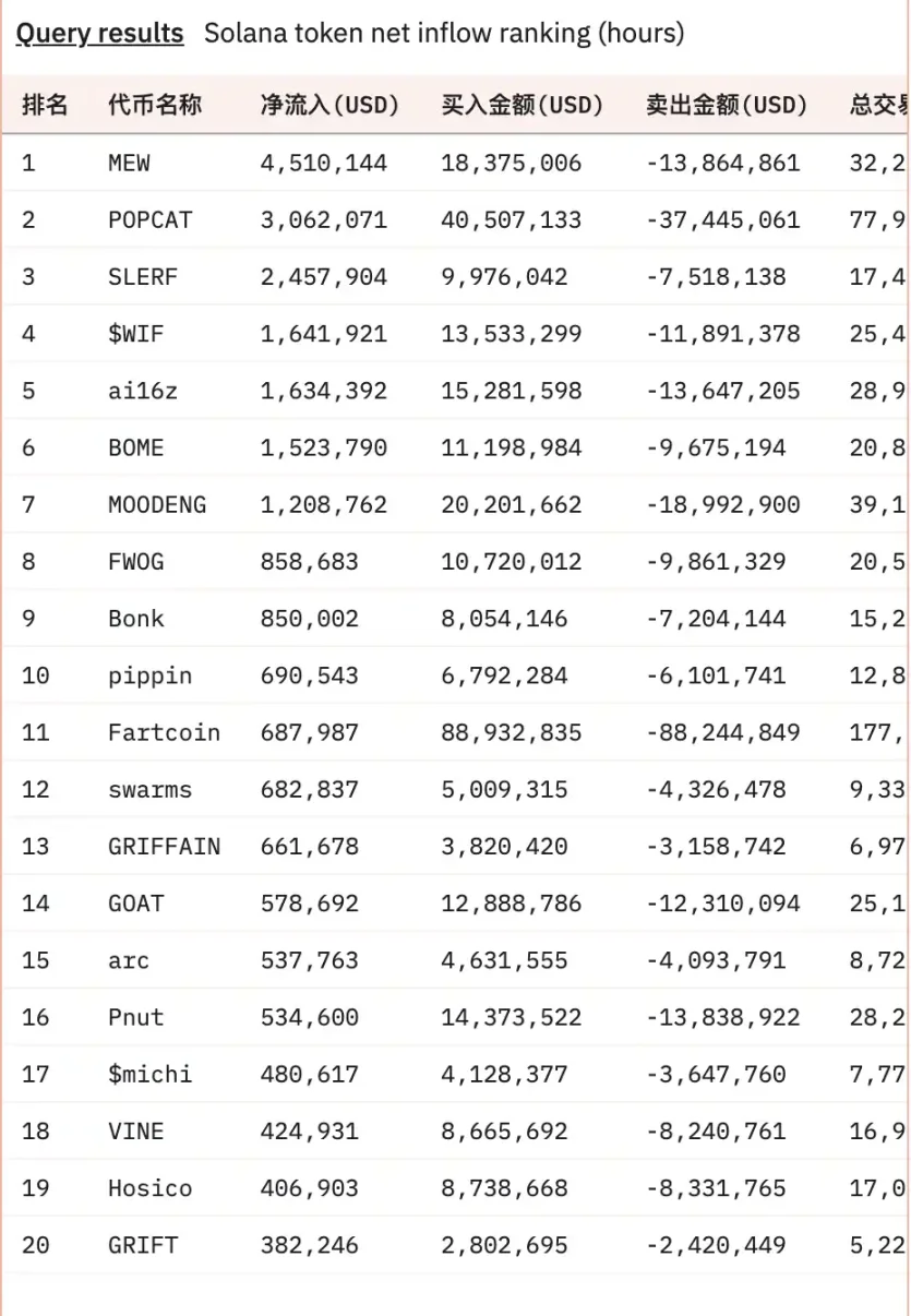 可以得知,近期流入量排名前段的代币几乎都是发射天数超过 150 天的老币,MEW、POPCAT、SLERF、WIF 等更老牌 Memecoins 占据大部分的流入量,而由近期放出发射平台 autofun 的 ai16z 为首的 AI 概念则占据另一部分流动性,一部分原因是前段时间的超跌的影响,另一方面是 Crypto 并未出现新的 AI 概念,因此成熟的 AI 项目也被聪明钱列为抄底的对象之一。