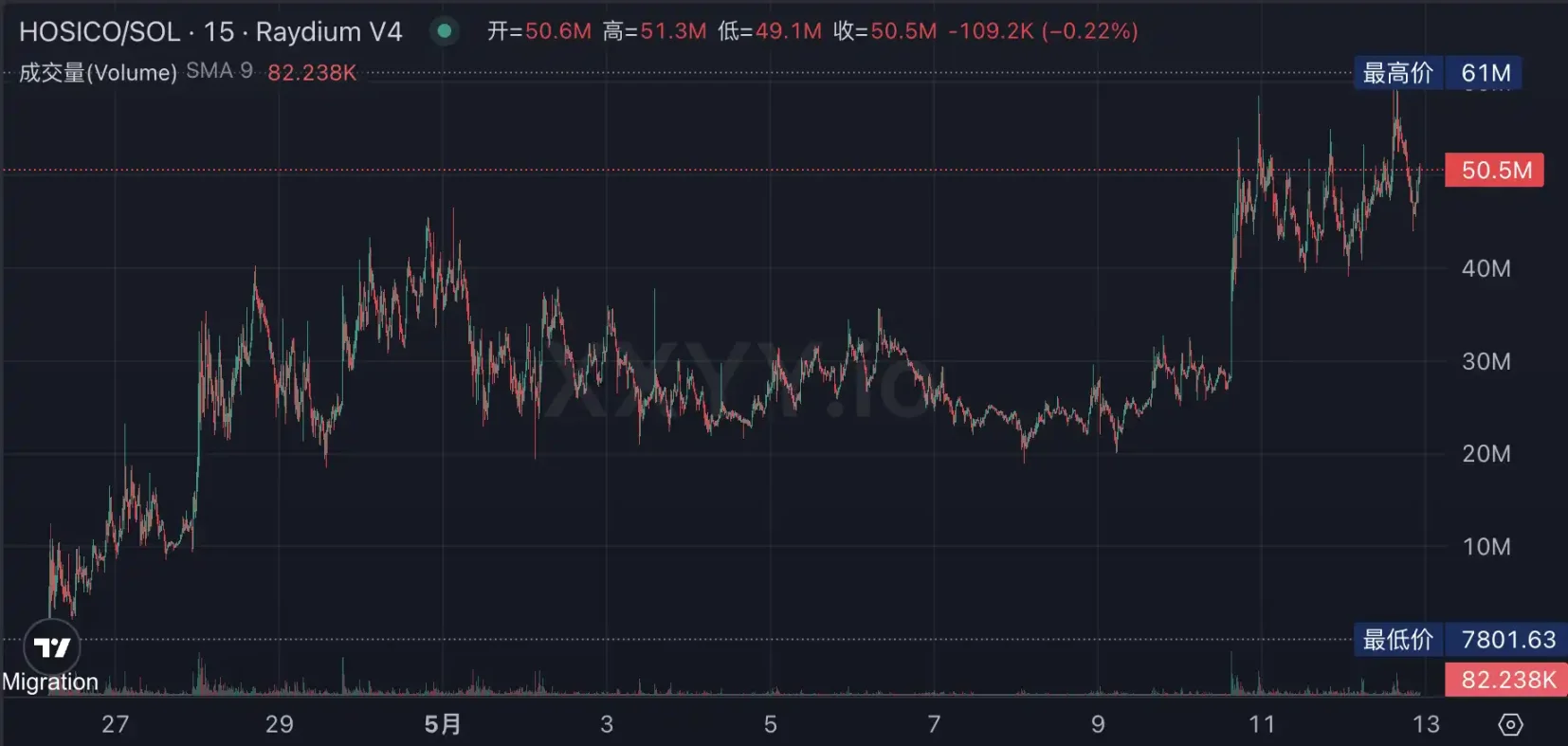 HOSICO 是笔者在 BONKFUN 上线时提到过的 Memecoin,同属 BONKGUY 推广的「初代」BONKFUN 代币 HOSICO 也持续着健康的 K 线走势,这个自 BONKFUN 上线以来就领先其他同期代币的网红猫,同时也被社区视为最有希望成为 BONK 首个突破 1 亿市值的 Memecoin。