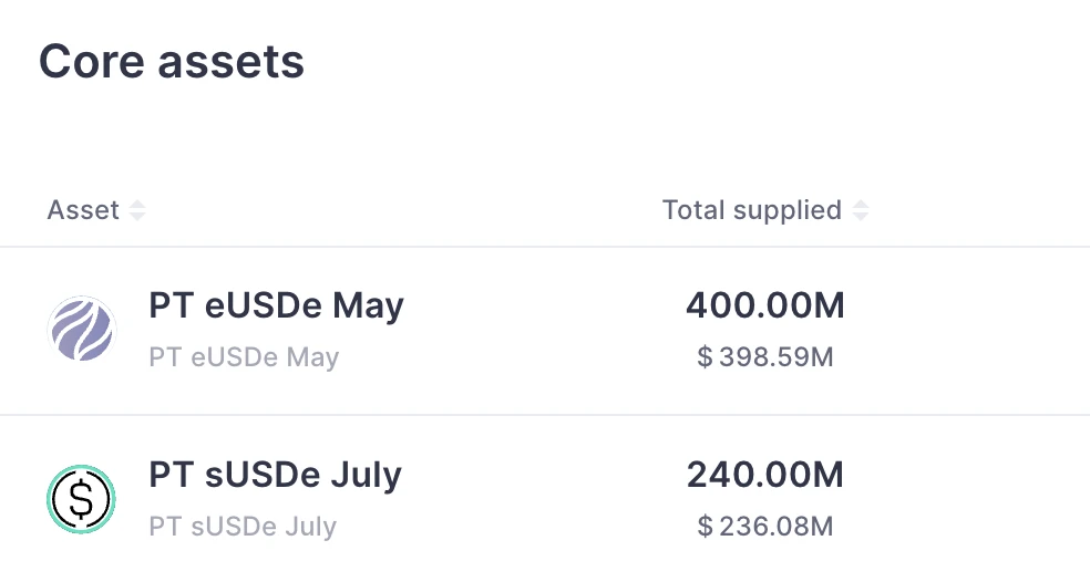 Aave 上个月已正式支持了 Pendle PT 资产,目前已上线的池子包括 eUSDe PT 和 sUSDE PT,两个池子的限额分别为 4 亿美元和 2.4 亿美元,目前均已存满。