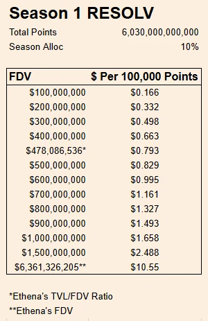 此外,Pendle 社区估算了不同估值条件下 Resolv 的积分价值,下图仅供参考。
