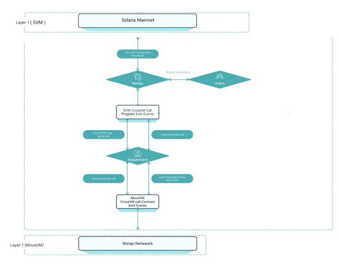 Solana VM 拥有业内领先的并行处理能力和高吞吐量,借助其 Sealevel 并行引擎能够同时执行数以万计的交易,这与 EVM 需逐笔顺序处理交易的模式形成互补。Mango Network 计划将 Solana VM 纳入现有的 Cross-VM Sequencer 机制中,实现不同虚拟机环境下的安全数据同步与状态一致性。