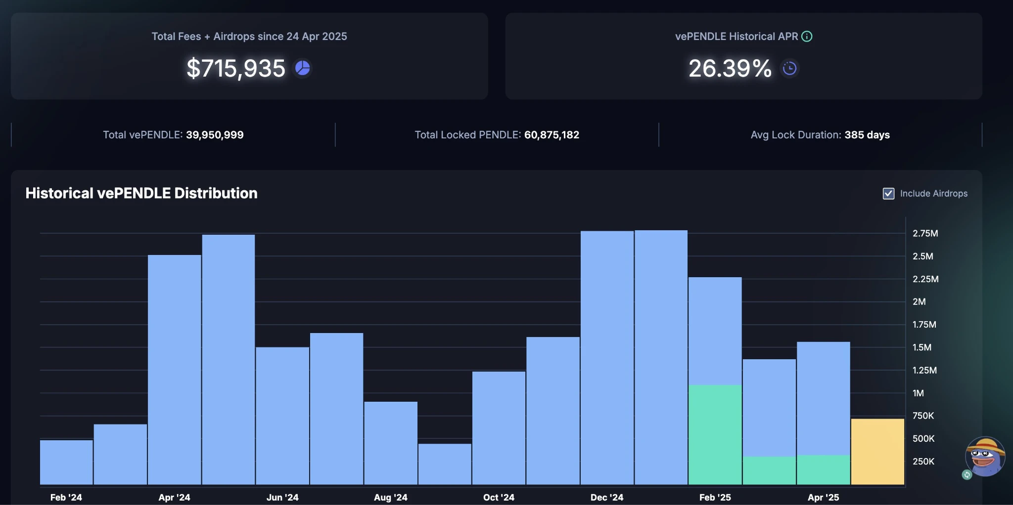Pendle 将 3% 的收益费用以及收益率加成分配给$PENDLE 质押用户。看板: https://app.pendle.finance/vependle/overview