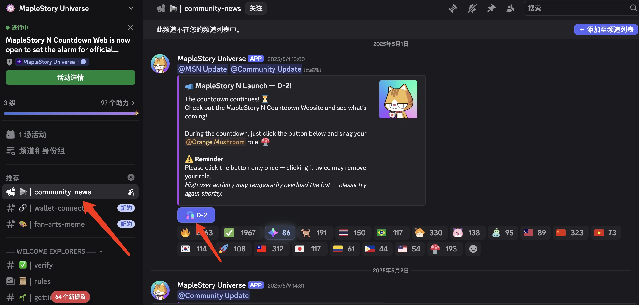 STEP 2. 进入 官方 Discord 后,选择“community-news”频道根据下图所示领取“蘑菇头身份”。