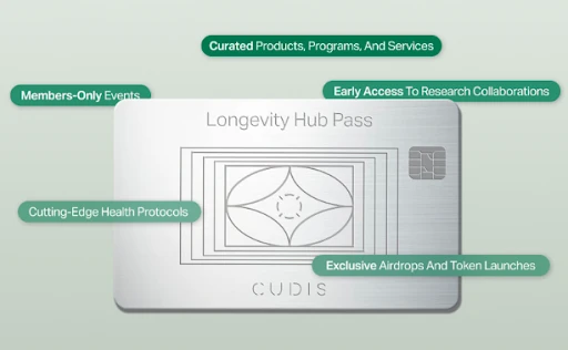 Longevity Hub(长寿中心)通行证。通过可升级的 SBT,帮助用户进入 CUDIS 长寿中心,并获得精选产品、项目、服务、会员专属活动、前沿健康方案,独家空投和代币发行以及长寿研究合作的早期参与权。