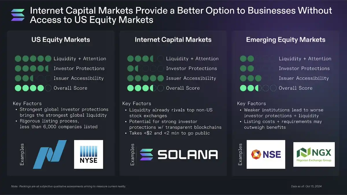 Solana 基金会主席 Lily Liu 是 Solana 致力于构建「互联网资本市场(Internet Capital Markets)」的布道者,在线上线下不同场合都曾解释到,互联网资本市场是指通过区块链技术打造全球金融基础设施,让 55 亿互联网用户都能参与资本市场的资产交易,这一愿景将 ICM 定义为一种去中心化的融资方式,打破传统金融的壁垒(如复杂文书和高门槛)。