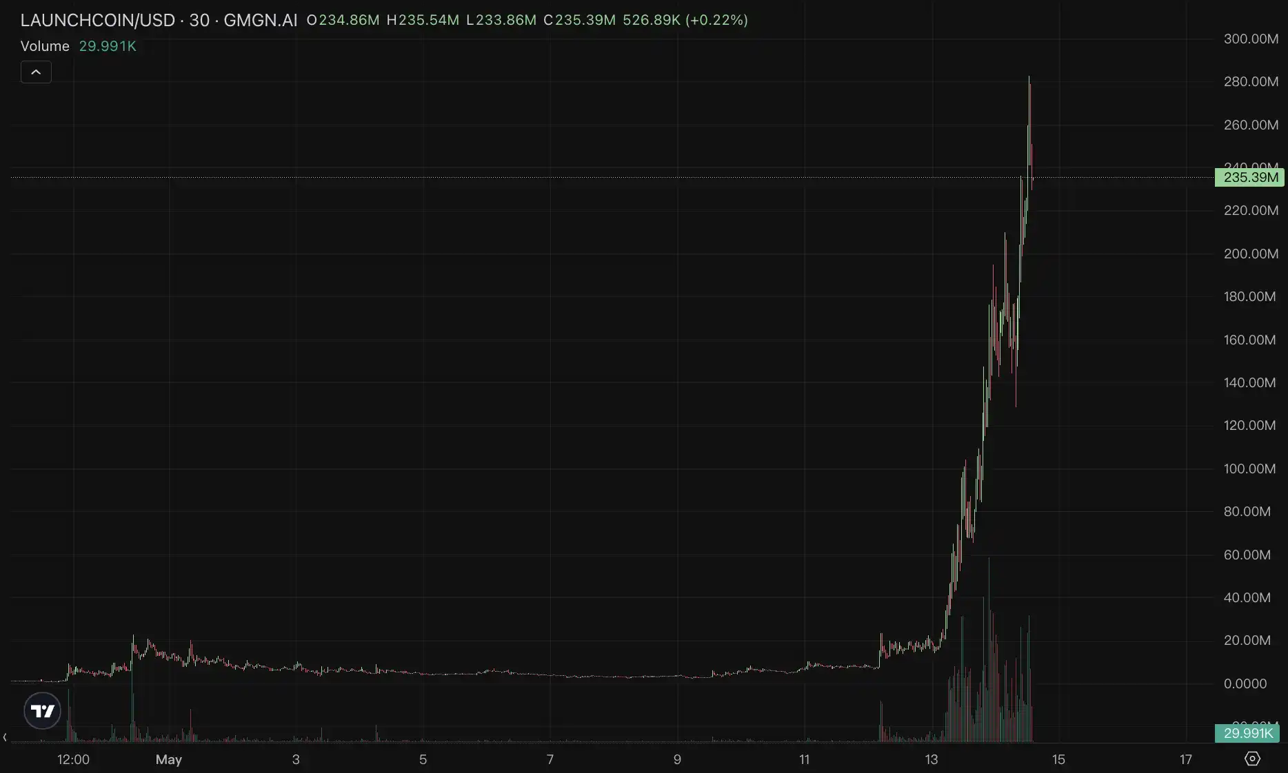 LAUNCHCOIN 当前市值达 2.35 亿美元, 24 小时涨幅达 220% 。