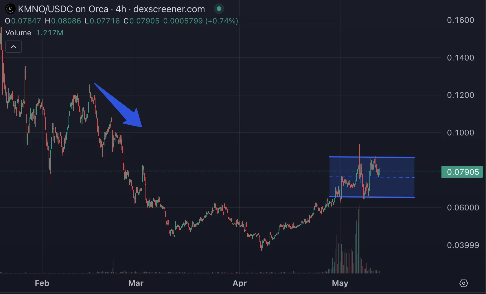 $KMNO:Solana 上的 DeFi 协议 Kamino Finance, 2 月 13 号进入币安 Alpha 后开始单边下跌, 从 4 月 28 号的一周时间里,交易量开始放大, 较两周前增长 40 倍,但是价格只在 0.065-0.085 之间波动. 直至 5 月 6 号在币安上线现货后, 交易量回归正常水平.