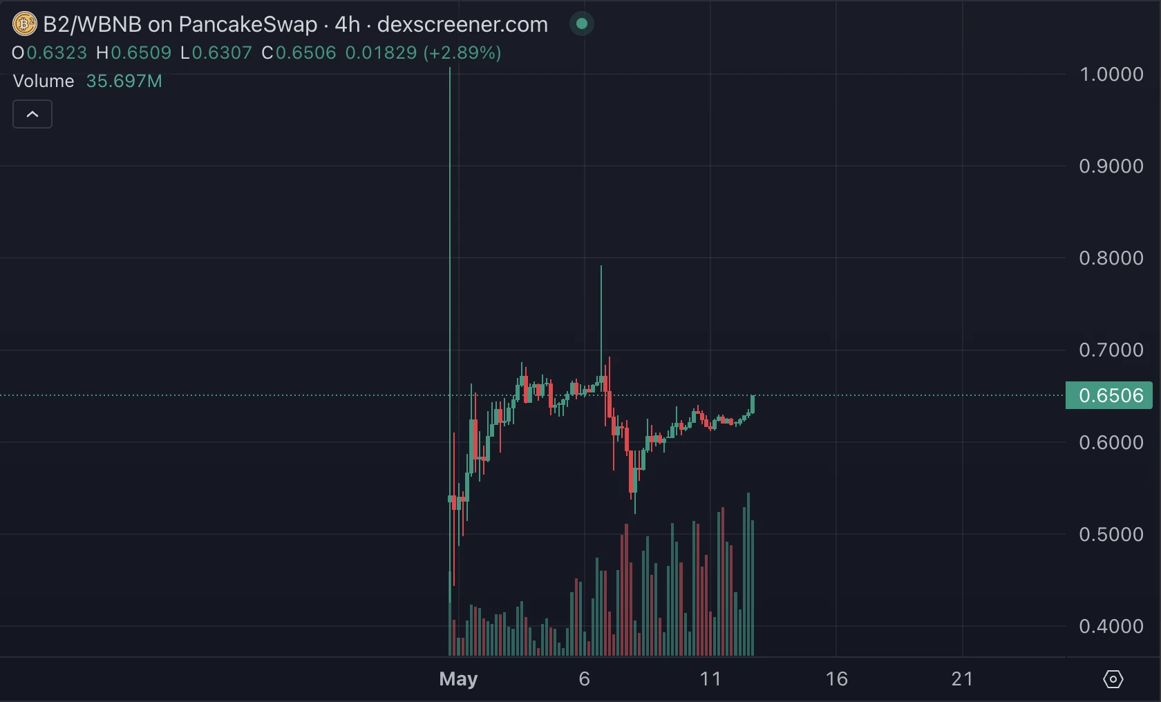 $ B2 :比特币生态L2协议, 4 月 30 号发币并进入币安 Alpha. 市值最高仅达到 3 千万美元,目前在 2700 万, 发币后交易量逐渐增加, 规律明显, 亚洲时间白天交易量放大, 晚上减弱.