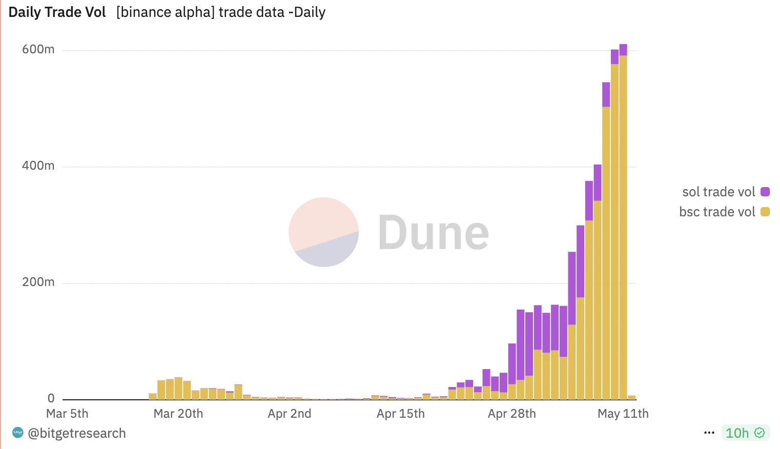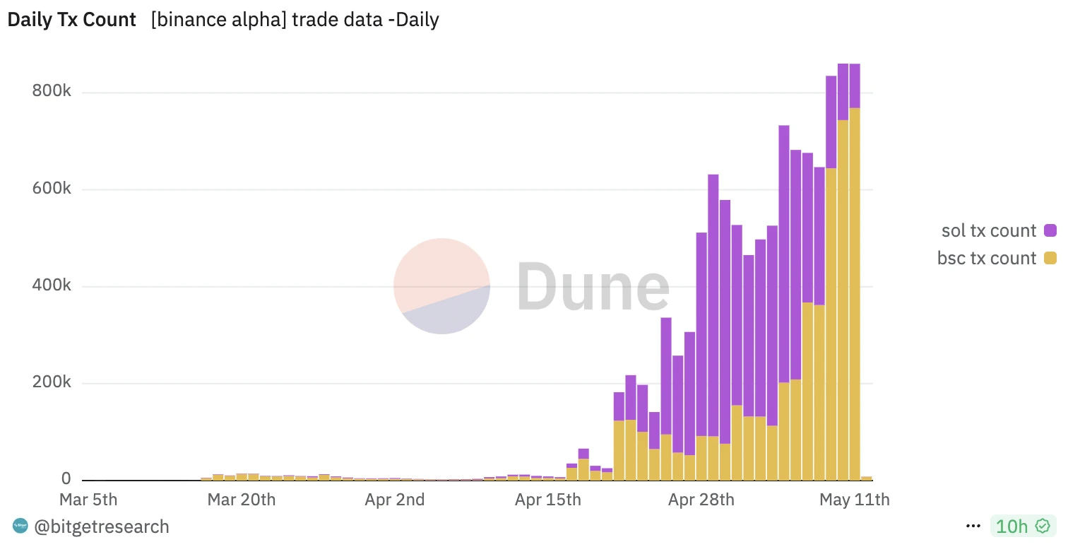 如果仅仅对比 Alpha 2.0 代币在 BSC 和 SOL 上交易量和交易次数的变化时可以发现.整体来看,Binance Alpha 2.0 在 4 月中旬之后迎来了爆发性的增长,且这种增长趋势持续至 5 月中旬。