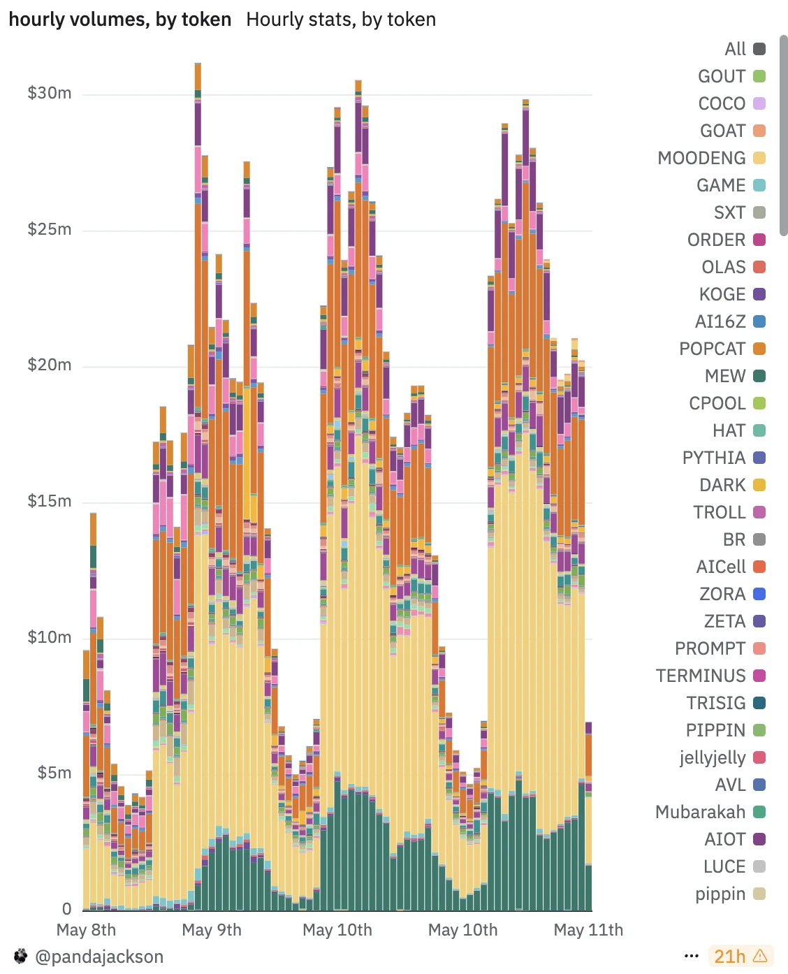 从小时交易量的图表中可以清晰地看出,Alpha 2.0 的主要交易量贡献代币具有极强的日内周期性波动特征。这种规律性的交易行为在 5 月 8 日至 5 月 11 日的四天时间内均有重复,表现为每日在 UTC 时间的凌晨至中午(大致为北京时间 8: 00 到 20: 00)出现交易量的显著放大,而在 UTC 下午至深夜(北京时间晚间到凌晨)交易量则明显回落甚至低迷。这种节奏与亚洲交易时区的作息完全吻合,表明 Alpha 2.0 的交易生态在当前阶段高度依赖于亚洲市场的流动性支撑。尤其是在亚洲白天活跃时段,单小时总交易量多次突破 2500 万美元,甚至一度接近 3000 万美元,显示出集中度极高的做市和交易操作。