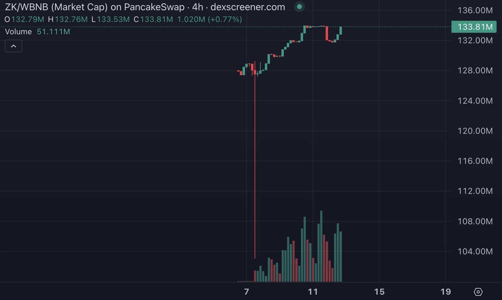 $ZKJ:ZK 协议 Polyhedra Network, 5 月 6 号发币并进入币安 Alpha. 市值 1.3 亿美元. 交易量的起伏和$ B2 类似,亚洲时间白天交易量放大, 晚上减弱.