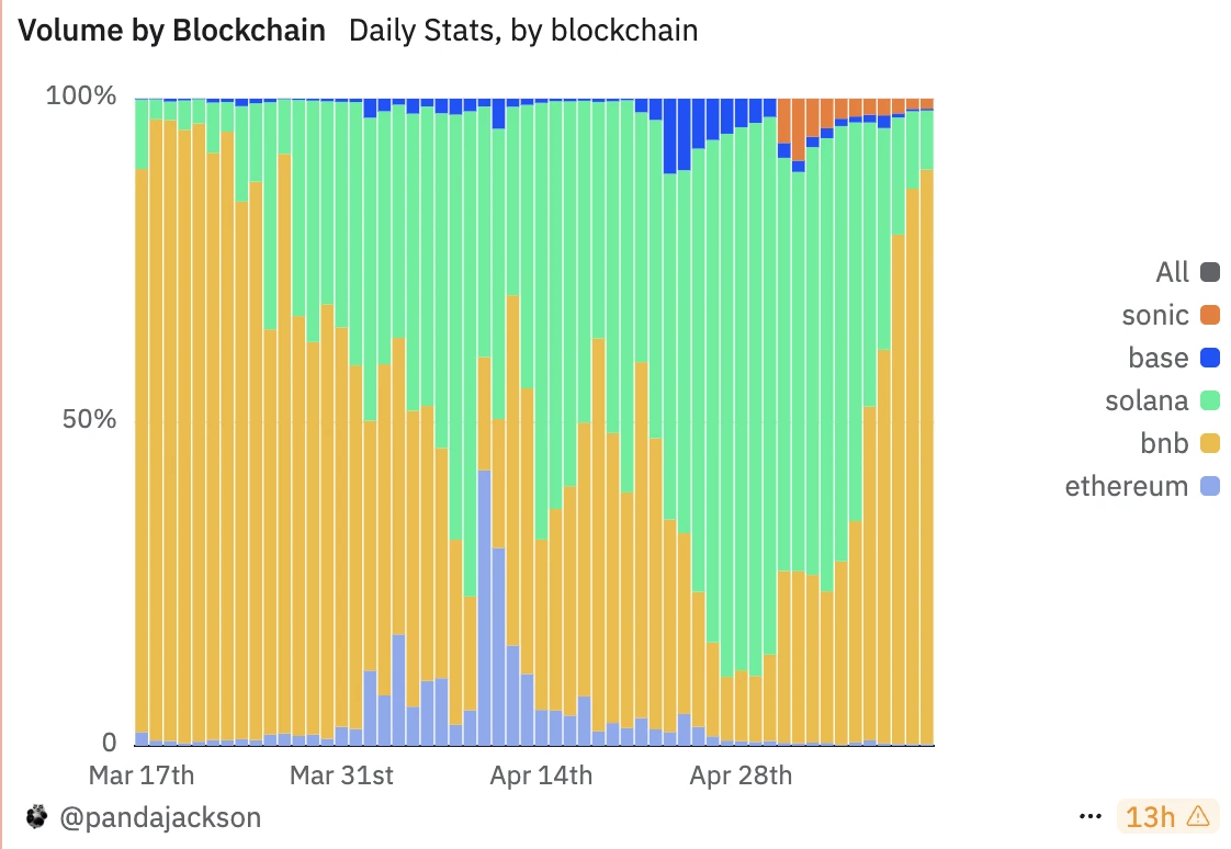 紧接着在 4 月下旬到 5 月初的这段时间里,BNB 链重新夺回主导位置,占比回升至近 60% -70% ,标志着一轮链间流动性回流。