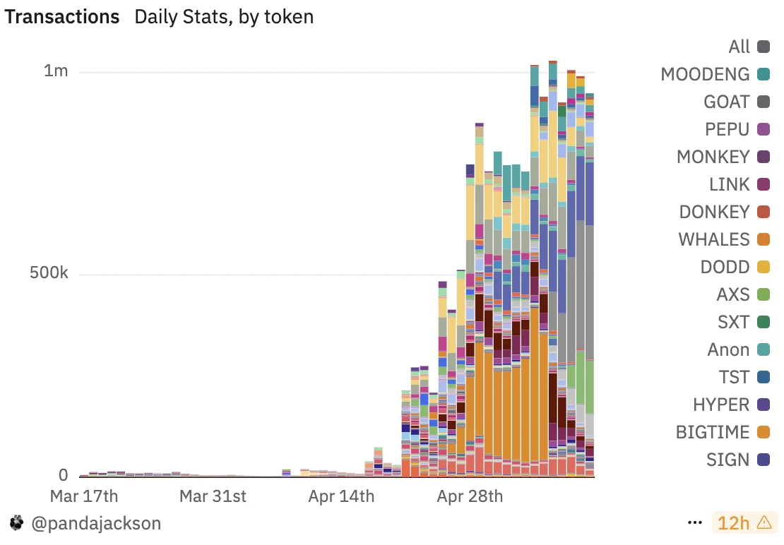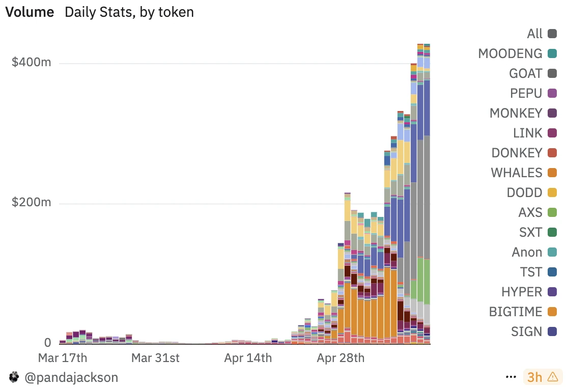 从下图可以看出,Alpha 2.0 代币的每日交易量在不同区块链之间经历了显著的结构性迁移,呈现出明显的阶段性主导链变化。从 3 月中旬开始,也就是 Alpha 2.0 规则变更之后, BNB 链(橙色)是绝对的主导力量,占据了近 100% 的交易量。但进入 3 月末和 4 月初之后,Solana(绿色)逐渐崛起,开始与 BNB 链争夺主导地位,并在 4 月中旬完成对 BNB 的“反超”,在随后约两周内稳定占据 60% -80% 以上的日交易量份额,成为 Alpha 2.0 的流动性主场,这段时间是市场的平淡期,个人认为可以将其看作 Alpha 2.0 的真实流量水平。