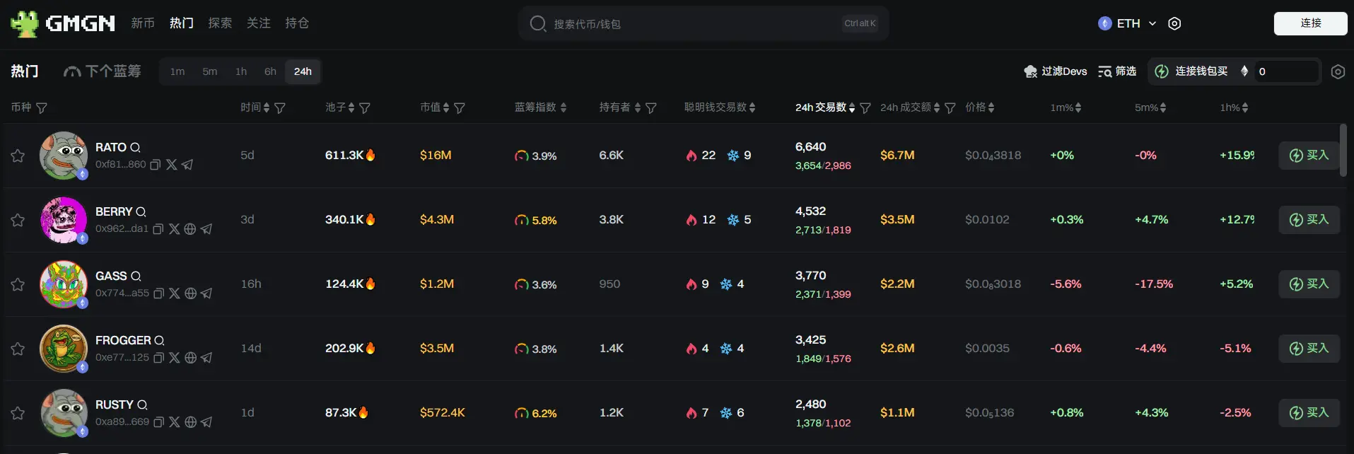 过去 24h 以太坊热门代币前五依次为:RATO 、BERRY、GASS、FROGGER、RUSTY